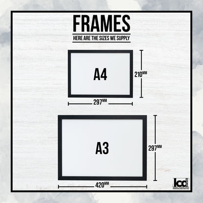 We also supply frames for our prints, these are available in both sizes, A4 or A3 and colours: Black & White.